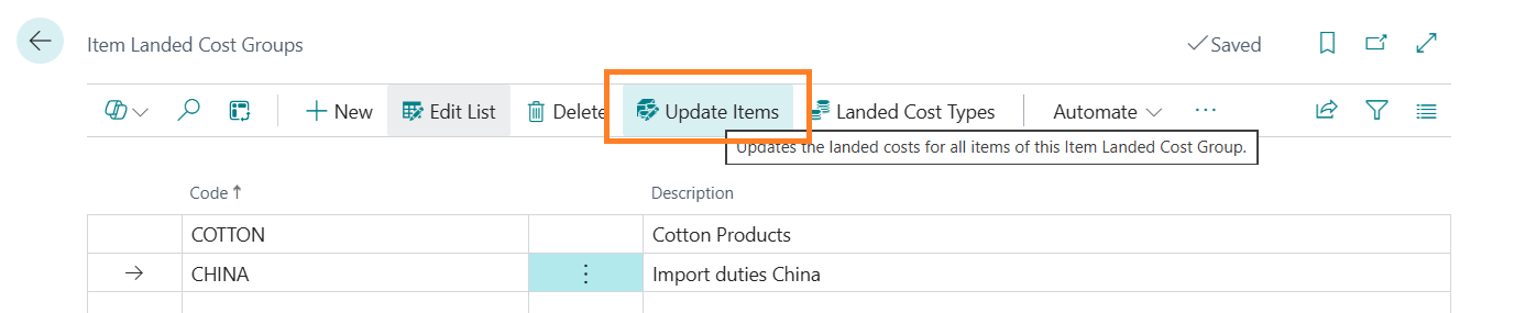 Use the button Update Items from the menu, to assign the Item landed costs to each item that is purchased with this group assigned on the item page. CS Landed Costs will update the item landed costs based on the Item Landed Cost Group as displayed on the Item page.